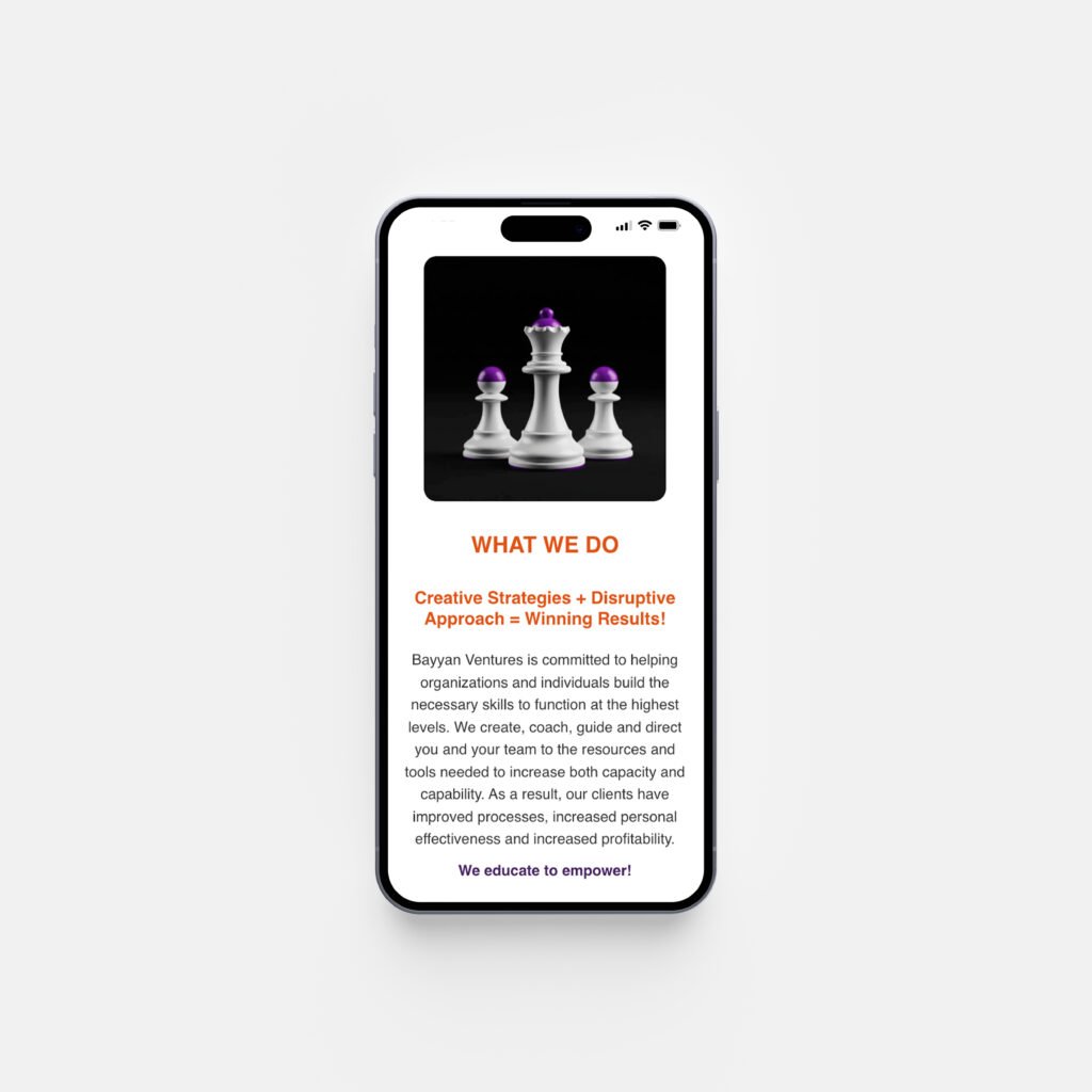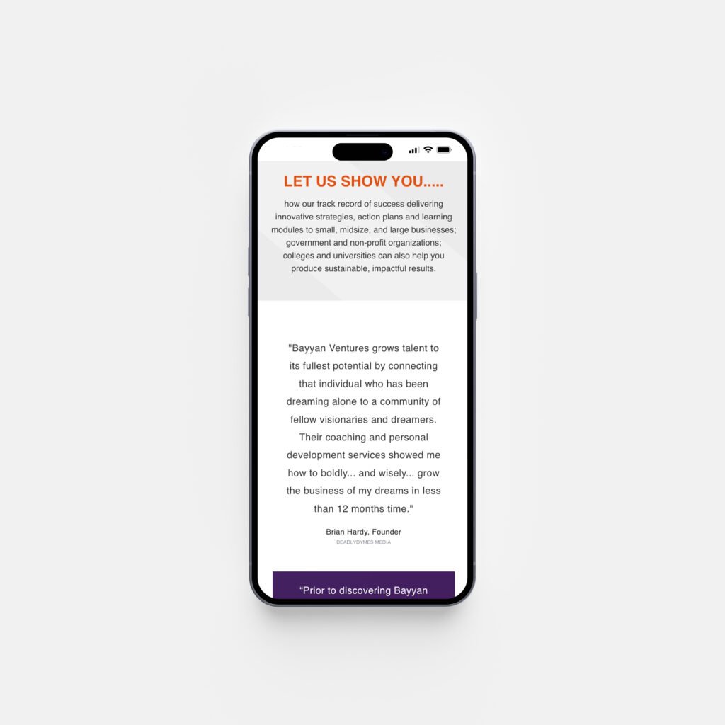 We partnered with Bayyven, founded by Vince and Patrice, to bring their vision of a Founder-focused platform to life. The website was designed to reflect their entrepreneurial spirit—clean, modern, and intentional. With a focus on storytelling and accessibility, Bayyven.com gives Founders a digital space to share their journey, connect with others, and build credibility. Our role was to design and develop a site that balances aesthetics with functionality, creating a seamless user experience that embodies Bayyven’s mission of empowering Founders.